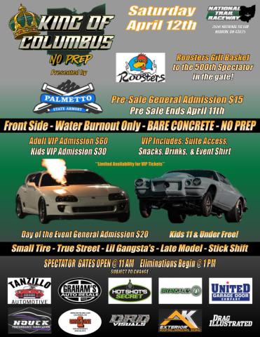 Submitted by jasonm on Sat, 04/12/2025 - 08:07 Today is the day! King of Columbus No Prep presented by Palmetto State Armory! Gates open at 9 am and Racing at 1 pm! Tickets available at the gate! Adults $20, Kids 12 & Under FREE! FREE Parking!! Free Pit Passes! Tags News Stories